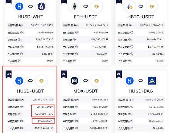 这是官方发出的基本信息,其中挖矿系数最高为MDX-USDT,而后是WHT-HUSD,而后是WHT-HUSD,而后是BTC-USDT、ETH-USDT以及HUSD-USDT。