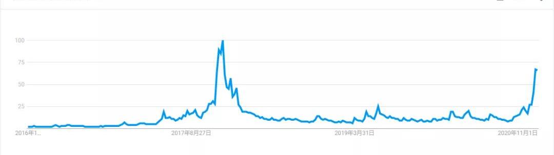 上图显示了谷歌的搜索兴趣,相对于过去5年图上的最高点。我们可以看到,目前的兴趣水平达到了2017年年底的峰值兴趣水平的75%左右。