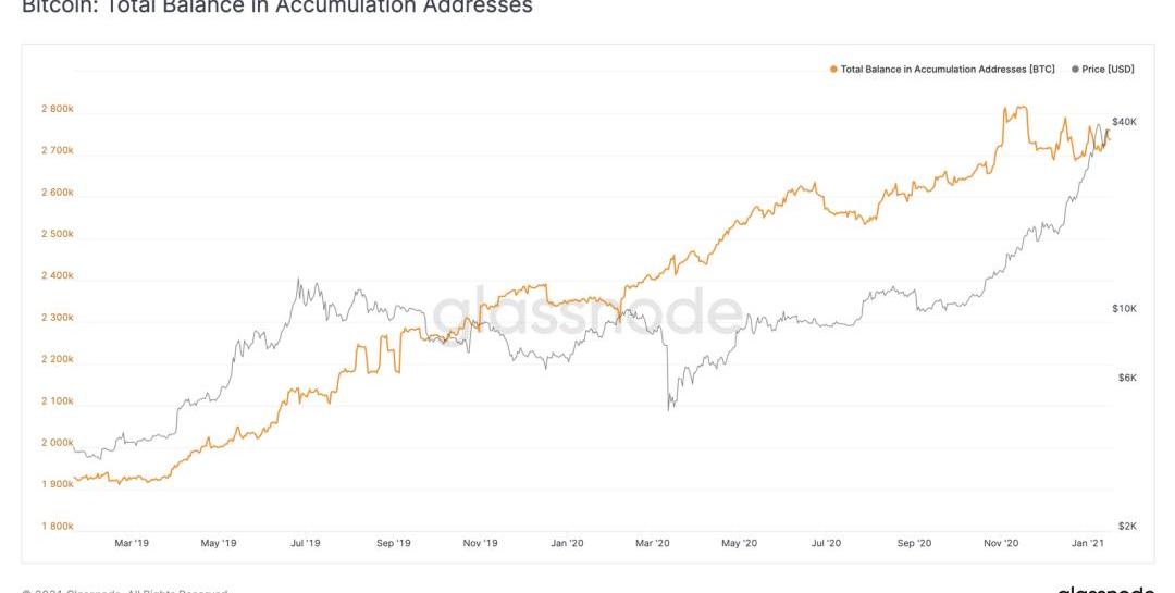 积累地址中持有的比特币数量已超过270万,仅一年就增长了17%。积累地址是只接收过比特币且从未使用过比特币的地址(不包括矿工和交易所地址)。