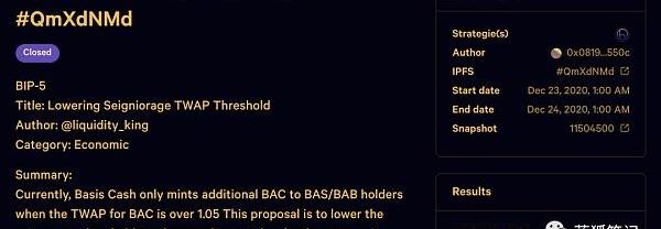 根据Basis的社区提案BIP-5的提议,Basis会实施动态铸币门槛,预期的初始铸币价格将会从当前的1.05降至1.037,这意味着未来BAC的TWAP价格超过1.037之后,就会生成BAC用以激励BAB和BAS的持有人。