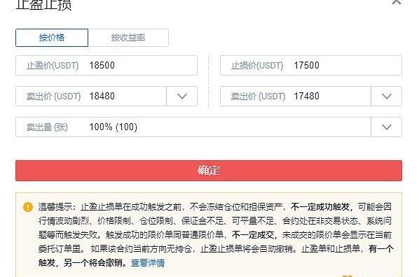 用户已持有100张持仓均价为17000USDT的BTC/USDT永续多仓仓位,而目前BTC/USDT市场最新价18000USDT。此时用户想针对该仓位进行止盈止损:?