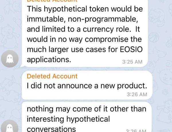 关于这个新的发现,他解释说,「这种假设的代币会是更局限于货币定位,不会比EOS的应用范围更广泛。」最后,在强调完自己并不是在宣告自己要做新项目后,BM注销了Telegram。