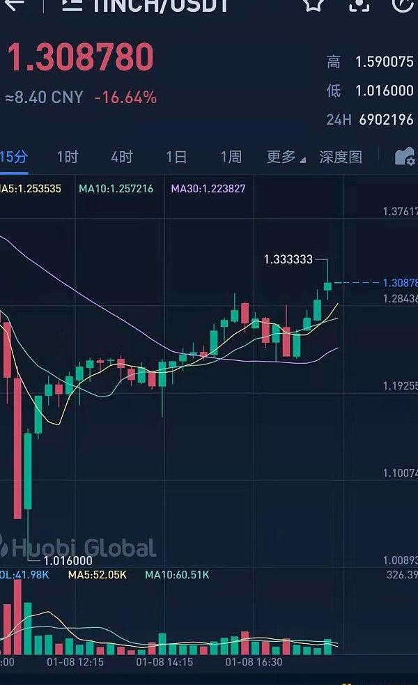 1inch平台表示,此前的流动性挖矿计划已成功结束,治理奖励的代币分发已进行约两周,至今已分发约63.2万枚1INCH代币,平均年化回报率为300%。在官方发文后,1inch的价格产生了波动,截止发稿最新报价为1.3USDT。