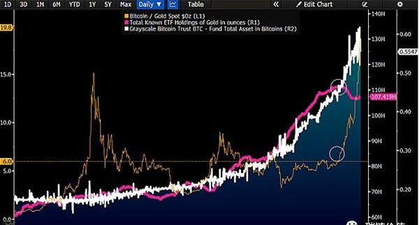 资金开始从黄金流出,流入比特币。在受监管的加密货币交易所里,比特币的资金流量正在不断增加,另一方面黄金市场的资金流出量也在增加,这可能说明比特币价格上涨有持久潜力。BloombergIntelligence分析了灰度比特币信托基金的资金流入量和黄金ETF持有总量的变化,其中: