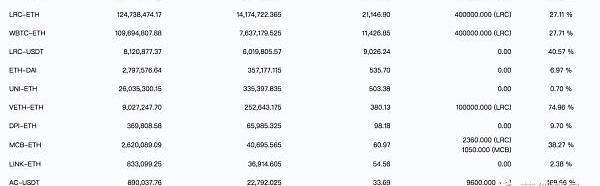 除了以上三个池的流动性挖矿之外,以下的代币池:AC/USDT池、WOO/USDT池、vETH/ETH池(100,000LRC)、MCB/ETH池(1,050MCB和2,369LRC)也有相应的代币奖励。