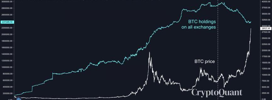 2020年,随着机构买进比特币,加密货币交易所的比特币持仓量开始减少