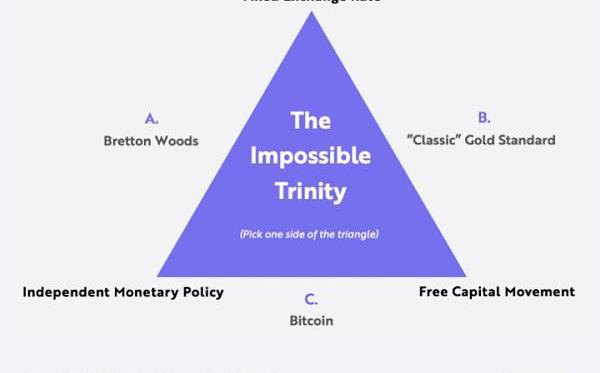虽然比特币的价格波动让反对者认为其无法成为价值存储工具,但实际上这却恰恰凸显了其货币政策的亮点。宏观经济学中的不可能三角对此进行了解释。如下图所示,三难困境假设,制定货币政策目标时,决策者只能同时满足三个目标中的两个,因为第三个目标与前两个目标中的一个是相斥的。