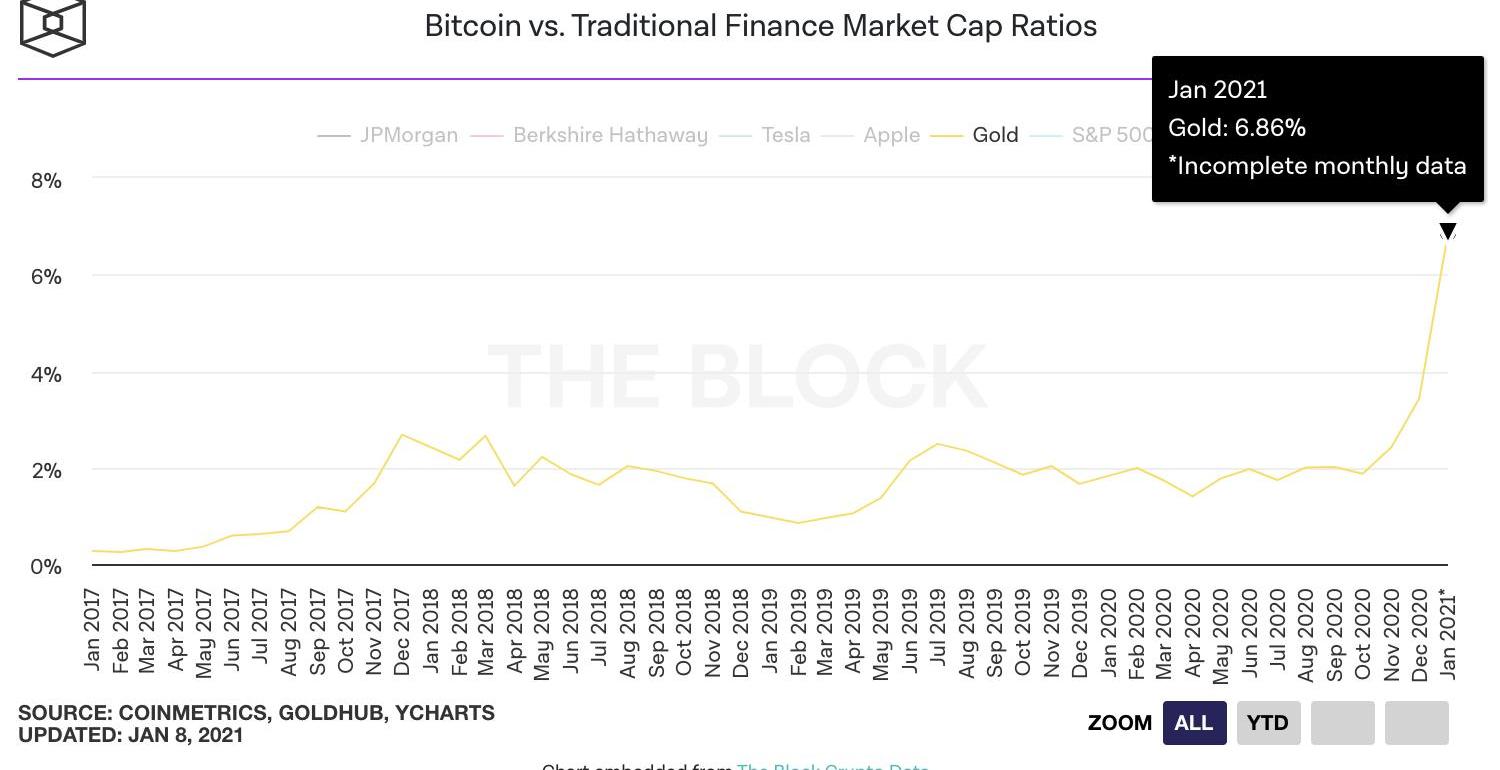 比特币今天又刷新了历史新高,比推数据显示,撰写本文时,比特币市值约为7,698亿美元左右,其市值已达到黄金市值的6.8%,接近7%。