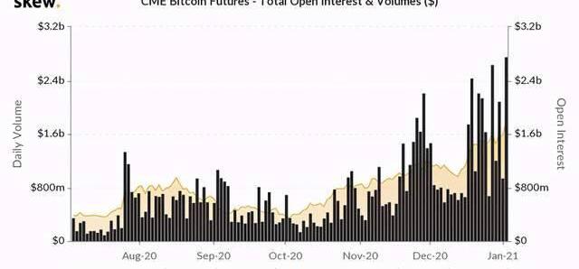 如所附图表所示,CME期货交易量创下了过去24小时的历史新高,金额接近27亿美元。在撰写本文时,日均交易量远高于7亿美元。