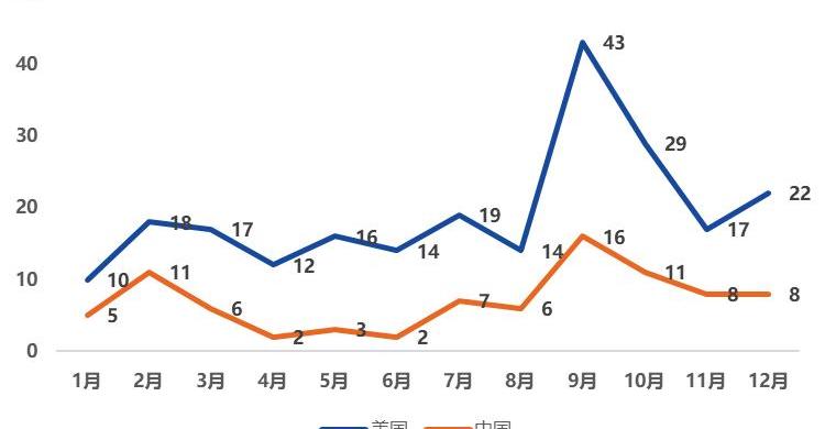 若仅从中美两国融资数量来看,2020年,美国区块链相关产业融资数量接近中国的3倍;9月,中美两国融资数量差距为全年最大;12月,美国融资数量为中国的2.75倍。
