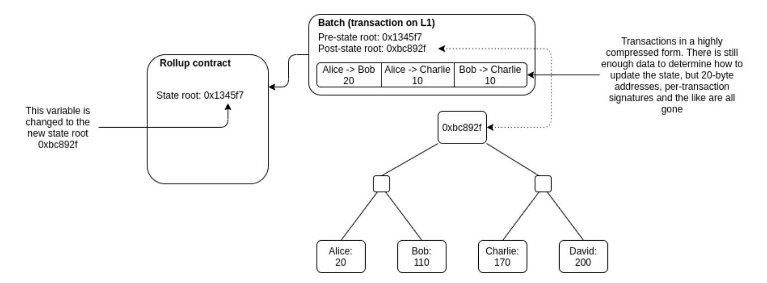 任何人都可以发布批次,这是一种以高度压缩形式的交易集合,包含了先前的状态根和新的状态根。合约检查批处理中的先前状态根是否与其当前状态根相匹配;如果是这样,它将状态根切换到新的状态根。