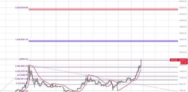 即便如此,比特币冲上$55,000美元仍是指日可待。首先,$55,000美元将到达斐波那契扩展2.618水平。由$200至$20,000美元的支持及阻力区间可见,价格持上升趋势;由$20,000至$3,000美元之间则呈下降趋势,再到$55,000美元至2.618水平。