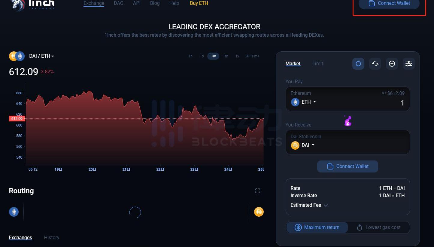 1.符合条件用户登陆到1inch网站:https://1inch.exchange/#/,点右上角链接钱包