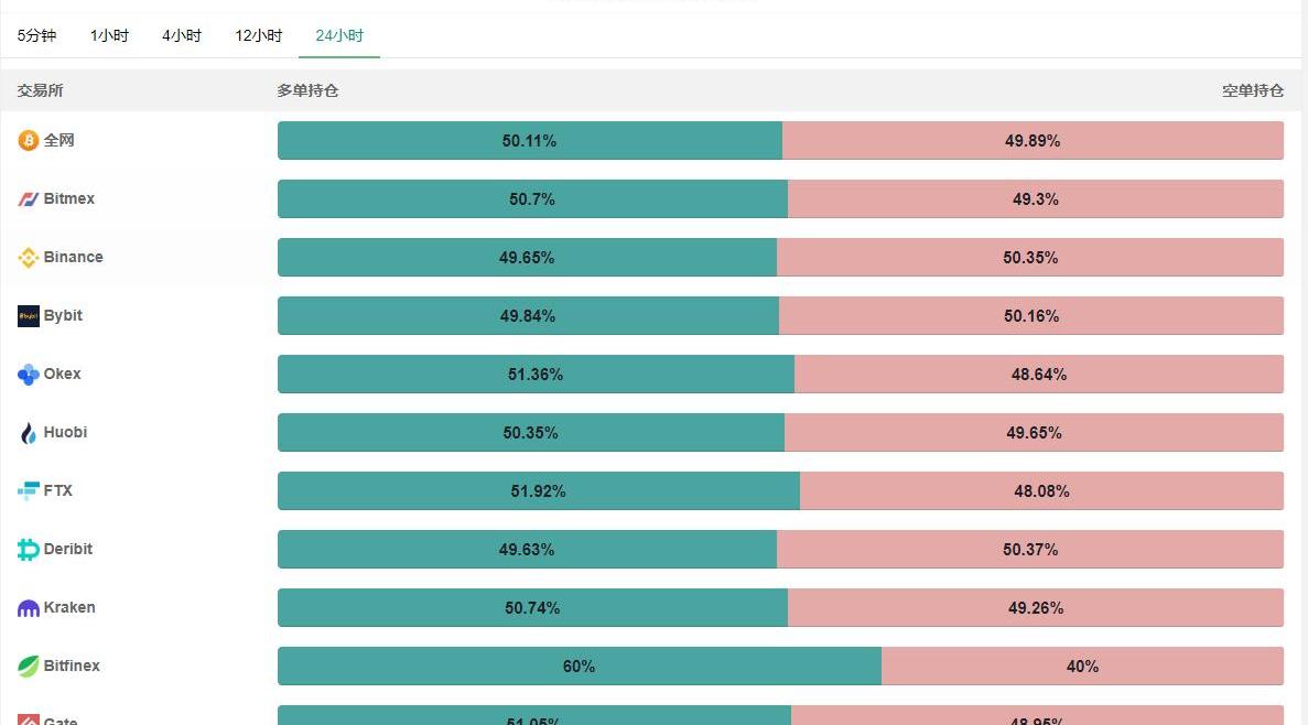 值得注意的是,目前全网交易所24小时比特币多空比例中,多方稍微占据一定优势。