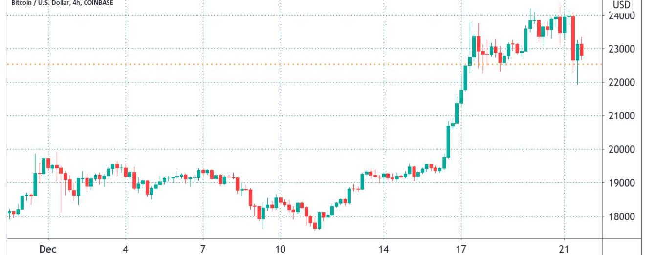这一事实似乎给了投资者更多的信心,比特币在12月20日达到24300美元,创下历史新高。