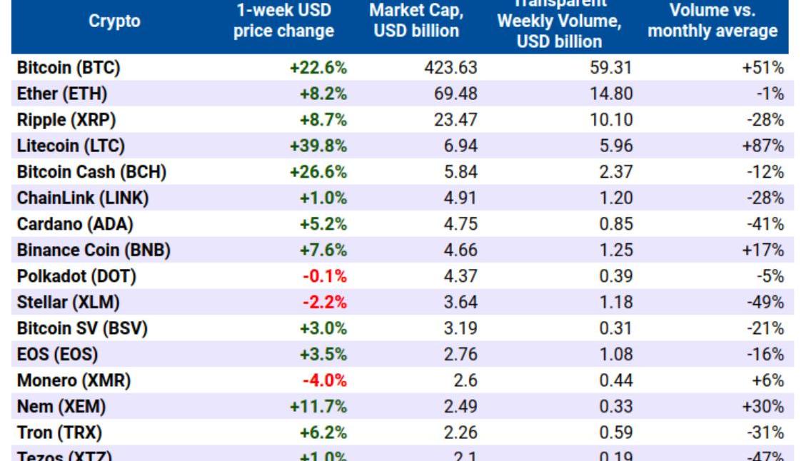 加密资产周表现前16名。来源:Nomics&CoinMarketCap