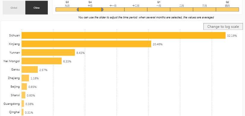 而在中国境内,主要的哈希率分布在四川、新疆、内蒙古、云南、甘肃、北京几地。