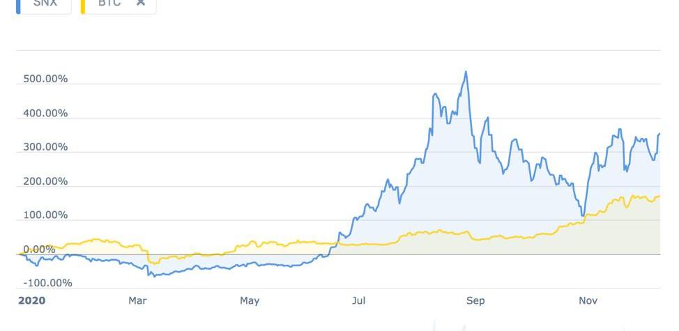 在市值前50的加密货币中,有14个加密货币跑赢比特币,其中今年热门的DeFi类代币有2个上榜,分别为YFI和SNX。YFI更是以1624%的涨幅排名第三。