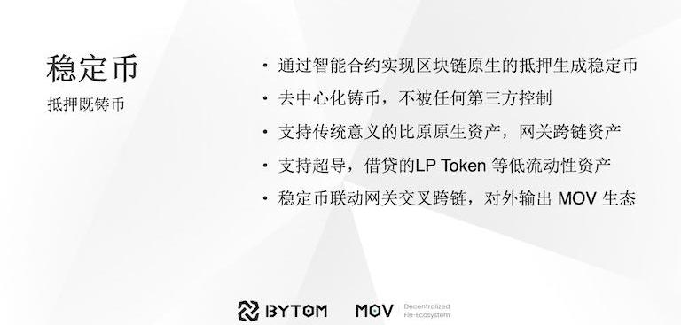 借贷之后会推出一个稳定币的产品,它的模式跟借贷很相近。唯一的不同就是借贷通过抵押借出别的用户存到池里的资产,你要付年化利息。稳定币是通过抵押链本身的原生资产给你铸造相应的稳定币。我们的一个特色是可以支持超导借贷这些lp低流动性资产的抵押。什么意思呢?正常的情况下,当一个用户把资金存到了超导借贷里面,虽然他能享受不错的年化收益,但是他的资金锁定住了,流动性就被完全锁定了。锁定同时可以拿到LPToken,允许它把LPToken抵押从而大大增加了资产的流动性。我这边把资产在借贷里面存了,换出稳定币,再换成别的资产,享受别的资产的生态。当然可以把这个稳定币换成自己存的原生资产,增加它的收益。因为整个过程其实都是在区块链上完成的,所以没有人的参与,从而保障了很好的安全性。稳定币这一块最关键点要联动网关,大多数情况下用户把外部的资产跨到比原生态中,与此同时也会升级网关将MOV上的资产,稳定币,BTM等跨到这些公链上去,通过这种模式也是输出MOV的生态。