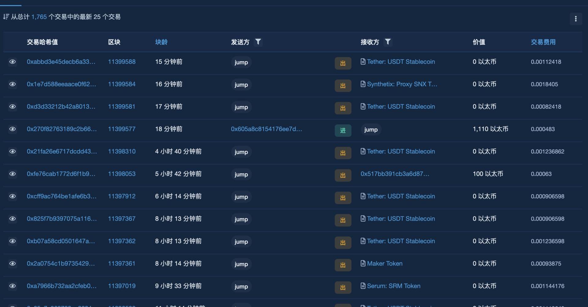 可以看出,Jump的链上活动较为频繁,最近的一笔链上转账为向币安转账5.6万美元