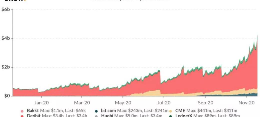 从Skew发布的下列三个数据中可以看出,自2020年年初以来,数字资产衍生品市场里的期货和期权的未平仓交易量大幅上涨,其中期权市场的交易量涨幅尤为突出。