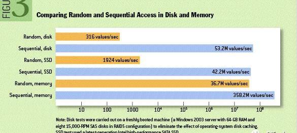 如图1所示,对磁盘的顺序操作甚至可以快过对内存的随机操作,而对同一类磁盘,其顺序操作的速度比随机操作高出三个数量级以上,因此我们可以得出一个非常直观的结论:应当充分利用顺序读写而尽可能避免随机读写。