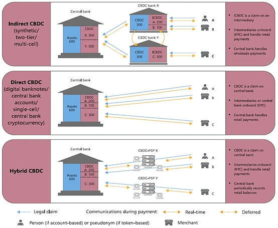 我们今天讨论比较多的人民银行的数字人民币(e-CNY)接近零售型央行数字货币,但又有一些根本差异。零售型央行数字货币涉及的问题要复杂得多。国际清算银行将零售型央行数字货币分为三种(下图),包括直接型、间接型和混合型。其中,直接型指央行无需中介,直接面向大众提供零售支付服务;间接型指央行依托中介机构发行数字货币,中介机构处理用户KYC和零售支付,央行处理批发支付;混合型是指央行引入支付服务提供商,支付服务提供商处理零售支付,央行定期记录零售用户持有央行数字货币的情况。
