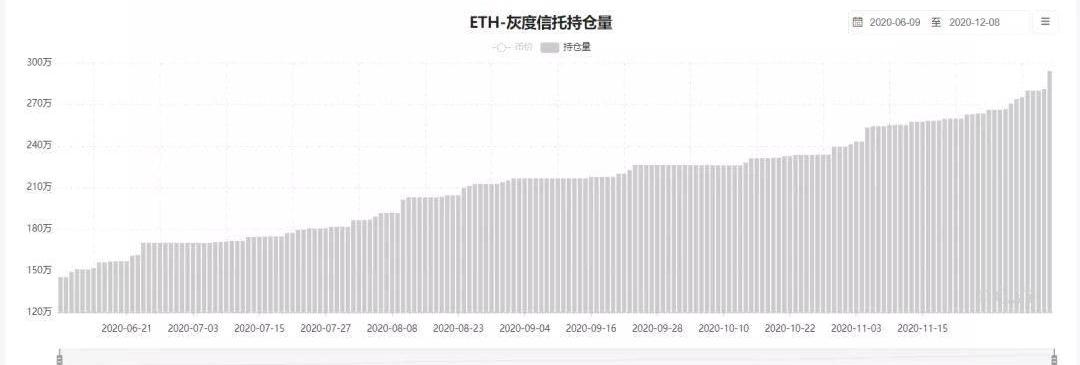 而同时灰度等机构还在持续买入ETH,下图为灰度ETH持仓图,目前已经接近300万枚,近日灰度买入的ETH数量已经在逐渐增加。从下图可以看出,仅12月8日灰度就买入了13万枚ETH。