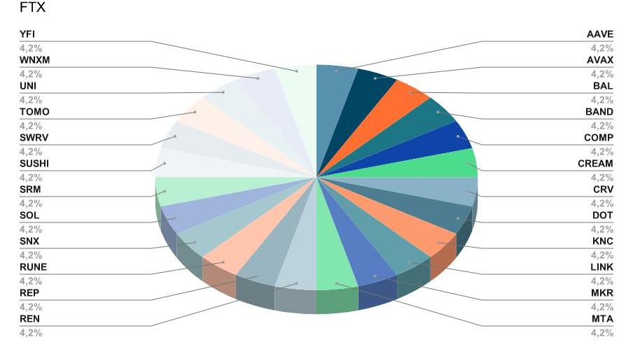 FTX的指数产品种类繁多,该交易所非常注重为不同风格的加密投资者提供一系列加密指数。FTX的DeFi指数是众多加密指数之一,包括以下代币: