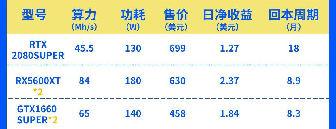 综合来看,两张RX5600XT显卡的算力和收益最高,但是功耗也很高,回本周期大概是RTX2080SUPER的一半。