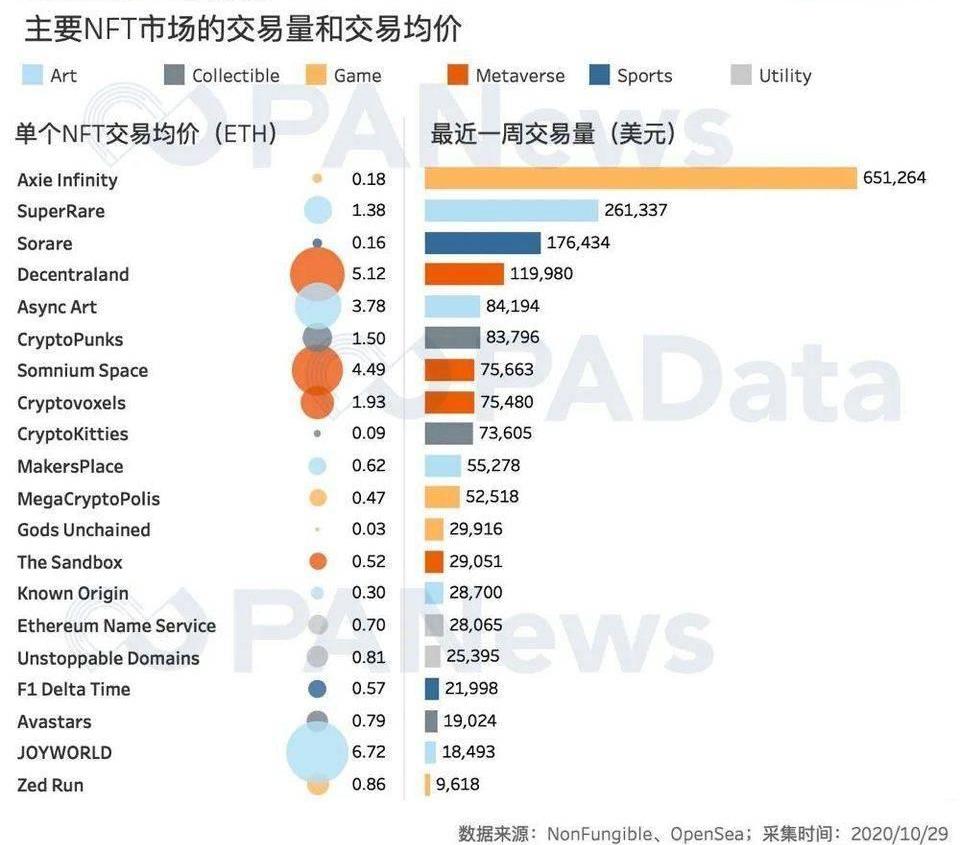 而游戏类的NFT成交价都不高,成交量最大AxieInfinity,单个NFT的成交均价只有0.18ETH,相当于72美元。