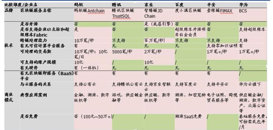 2)与其他区块链和技术的兼容方面,仅蚂蚁链兼容企业以太坊,仅蚂蚁链、百度、华为支持超级账本,仅蚂蚁、京东、华为表示支持跨链;