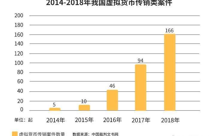 据中国裁判文书网统计,2018年,我国虚拟货币的类案件多达166起,2017年为94起;2016年为46起;2015年为10起;2014仅有5起,而近几年的案件年均增长率超过100%。