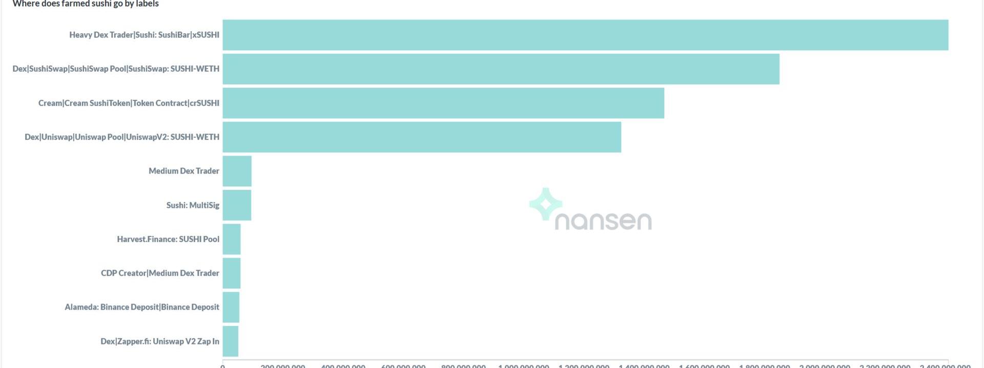 为了确定这一点,我们可以再次利用Nansen的标签。为了更全面的了解,我们可以尝试将所有的标签归类到一起,试图了解大部分的SUSHI代币都去了哪里。