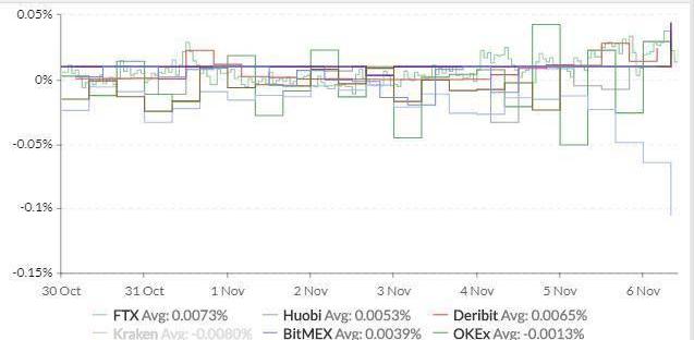 同样,以太坊永续合约的资金费率也普遍呈上行趋势,有且仅有OKEx的平均资金费率为负值,为-0.0032%,币安和BitMEX最高,分别为0.0231%和0.0220%。