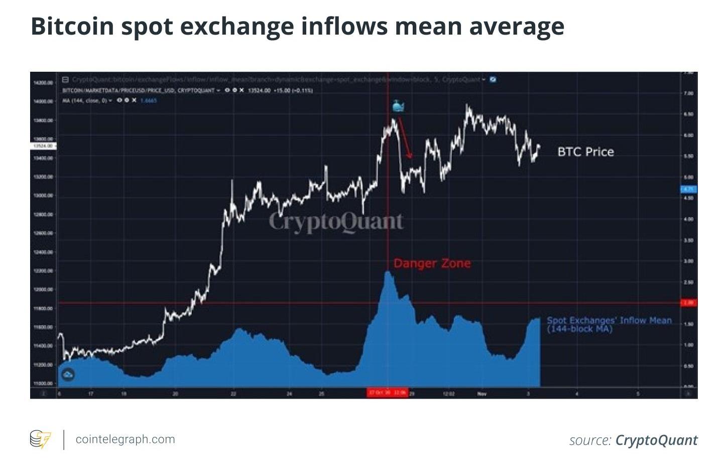 例如,10月12日,流入美国交易所的比特币突然飙升至危险区域上方。他们一这么做,比特币就在短时间内大幅下跌。在过去的两周里,交易所流入一直远低于危险区域。这降低了短期内突然回调的概率。