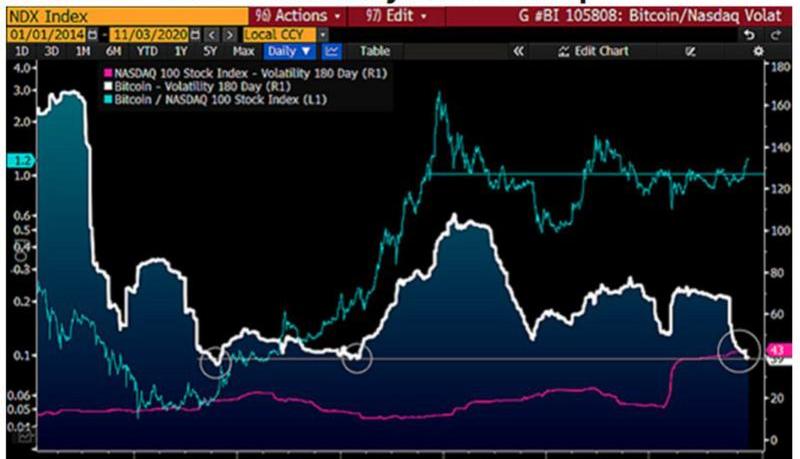现在,这里是要注意的地方,比特币的波动性较小,但仍处于这样的水平。根据最近的一份报告,比特币现在正相对于纳斯达克获得风险调整后的优势。