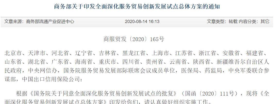 商务部发布《关于印发全面深化服务贸易创新发展试点总体方案的通知》