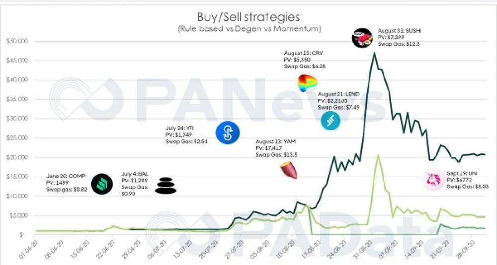 1.在本文中,我们将对DeFi三大投资策略进行了回测,分别是:持有ETH、买/卖治理代币、以及收益耕作治理代币;