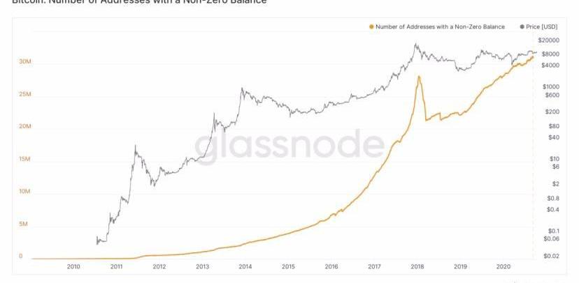 上一轮大牛市结束之后,大量高位接盘的投资者被迫于币价寒冬中割肉离场,致使大量的比特币地址被清空,活跃地址数和非零地址数持续下降。2020年以来,尽管比特币在新冠肺炎和全球金融市场的影响下剧烈震荡,但由于第三次减半的到来以及不断恶化的国际经济环境提振了避险需求,越来越多的投资者涌入比特币市场。