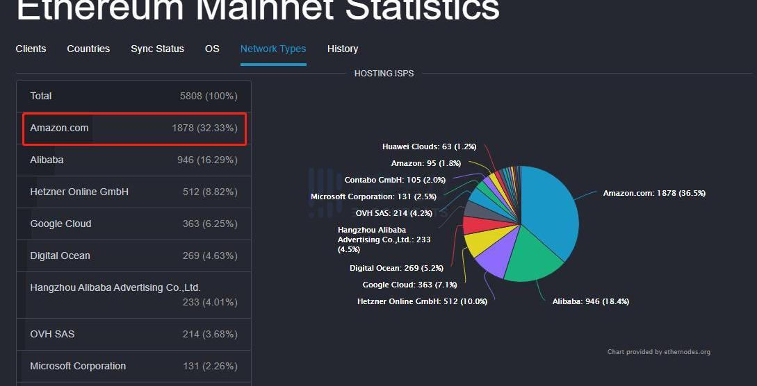 这已经不是加密社区第一次对中心化的云服务承载着大部分以太坊节点一事表示担忧了。2019年9月,云服务提供商Chainstack发表的一份调查中显示,中心化的云服务承载着大部分以太坊网络,其中有61.6%的以太坊节点在云上运行。报告称,亚马逊云服务AmazonWebServices间接运作近25%的以太坊节点。