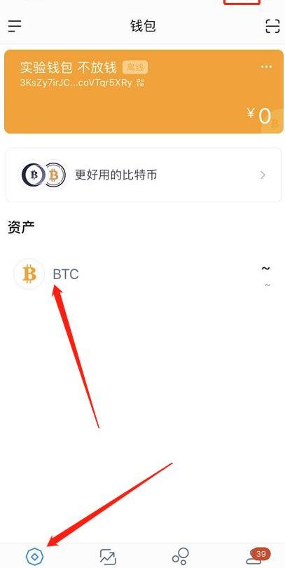 看到左下方的钱包,然后点击箭头所指,出现收款页面,将交易所或者别的钱包的BTC提款到这个钱包地址里即可。