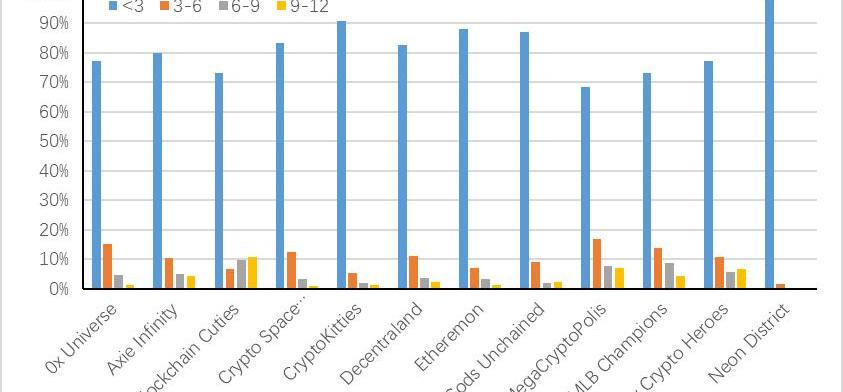 NFT项目整体的用户活跃度不高,如下图所示,2019年12个前列项目里,绝大多数用户仅保持了短于3个月的活跃。