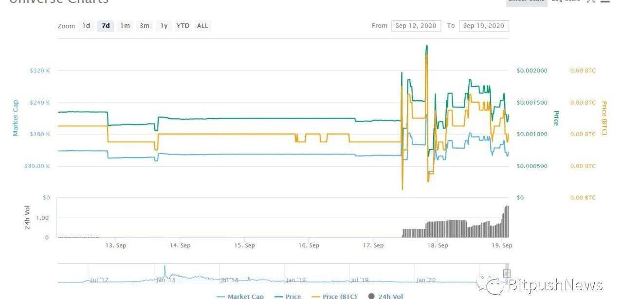 其中UNICORNToken过去24小时上涨同样超过100%,最高时涨幅超过1000%。此外,从价格和交易量看已经“归零”很久的Universe和UNICOIN代币的价格和交易量同样在过去两天内陡增。