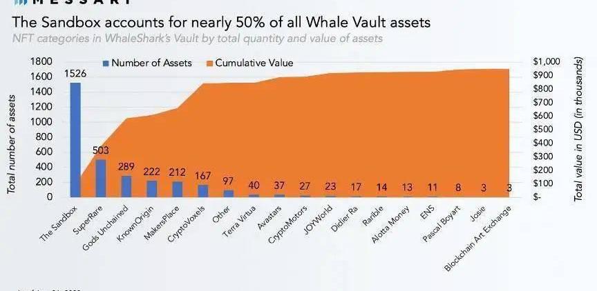 根据Messari的数据,在该项目金库中,过半的NFT来自于Sandbox。而SuperRare、GodsUnchained、CryptoVoxels和TheSandbox这四个项目之中NFT资产占投资组合总价值的80%。(数据来源:Messari)