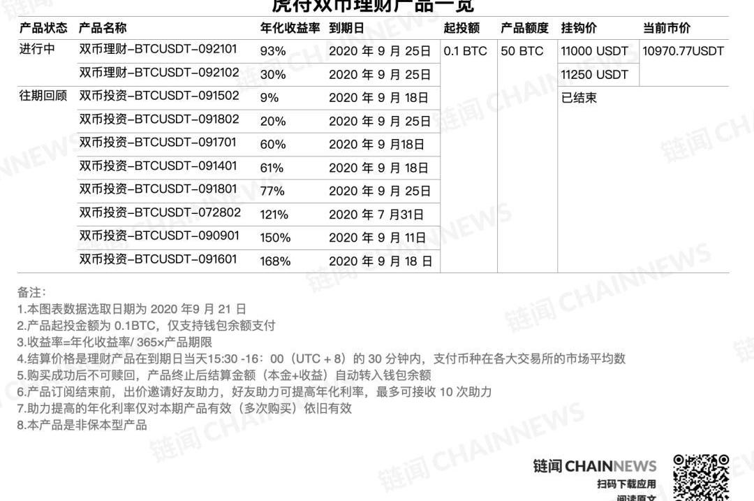 虎符双币理财产品目前在进行中的为「双币理财-BTCUSDT-092101」和「双币理财-BTCUSDT-092102」两种,年化收益率为30%和93%,起投额为0.1BTC,产品额度为50BTC。