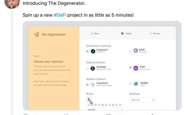 配图显示了一个名为“thedegenerator”(退化器)的UI界面,列出了6个当前比较火的合约,分别是Compound、Aave、Synthetix、YFIIII、Ampleforth和Based。从图片看,用户可以自助选择合约,点几下就可以生成一个DeFi项目了。“淘金热”可不是白叫,这么有趣的创意,怎么可能被放过?几个小时后MEME就拥有了自己的官网,网站上基本用户界面齐全,还有Telegram群链接。好奇的人太多,不到1个小时的时间里,500人涌入群中,MEME社区初见雏形。30分钟后,MEME通证诞生了。