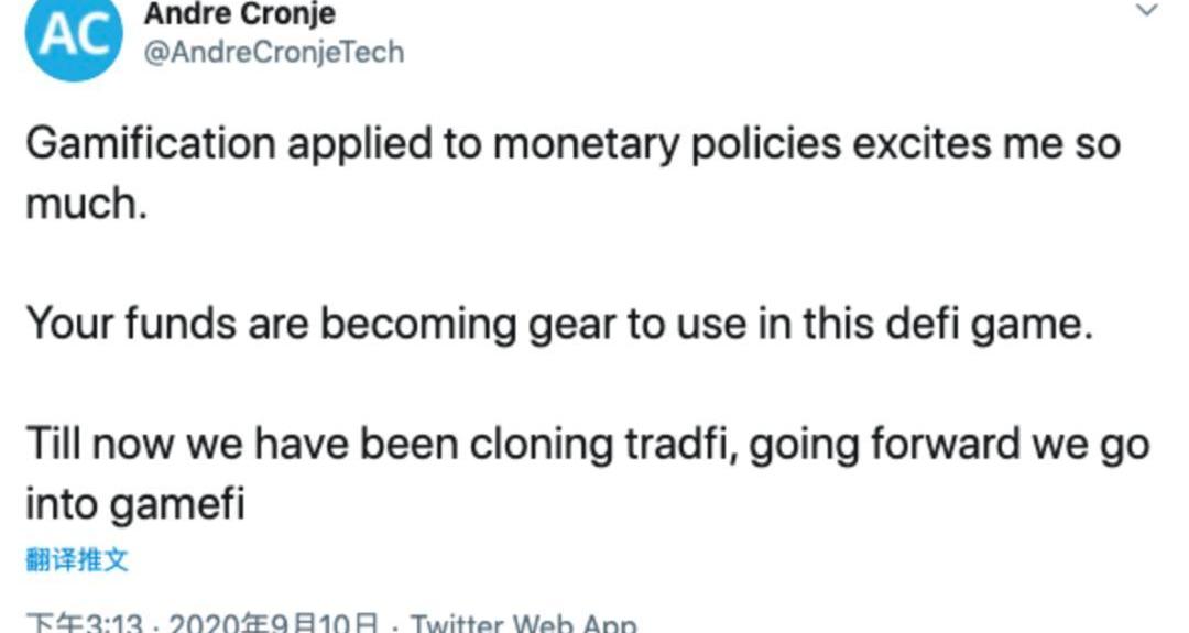 根据AndreCronje的推特,我们推测,Gamefi这个词是AndreCronje其个人对于行业发展的总结及判断。区块链游戏一直是整个行业版图中不可或缺的部分,而区块链项目偏向「游戏化」发展的趋势也由来已久,Gamefi这个总结可以理解成「游戏」或「游戏化」,可能是资金玩法上的游戏化,也可能是纯粹的融合NFT的游戏项目。