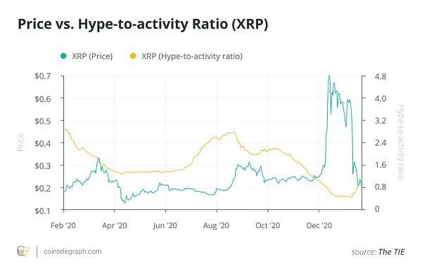 Cointelegraph通过分析加密货币数据平台The Tie的信息,研究了资产与价格之间的炒作活动比率指标。