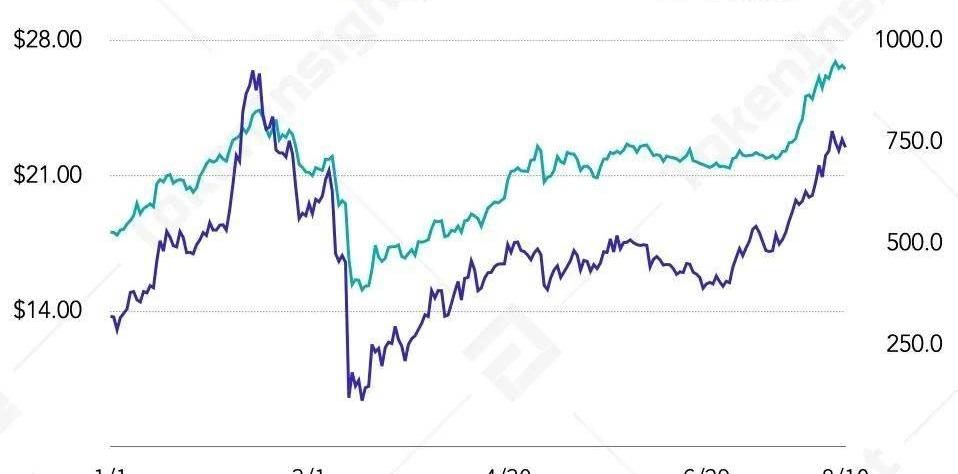 各平台币在第二季度与ETH的相关性较小,而受到DeFi热度影响,最近30天的已高度正相关。